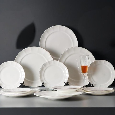 طقم أواني فخار للمطاعم من الخزف الأبيض بجودة عالية للبيع بالجملة بحافة ذهبية هدية الزفاف